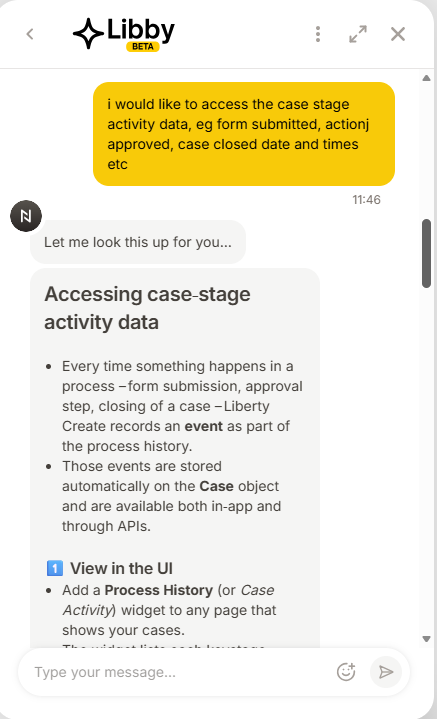 I asked Libby “I would like to access the case stage activity data, eg form submitted, action approved, case closed date and times etc”