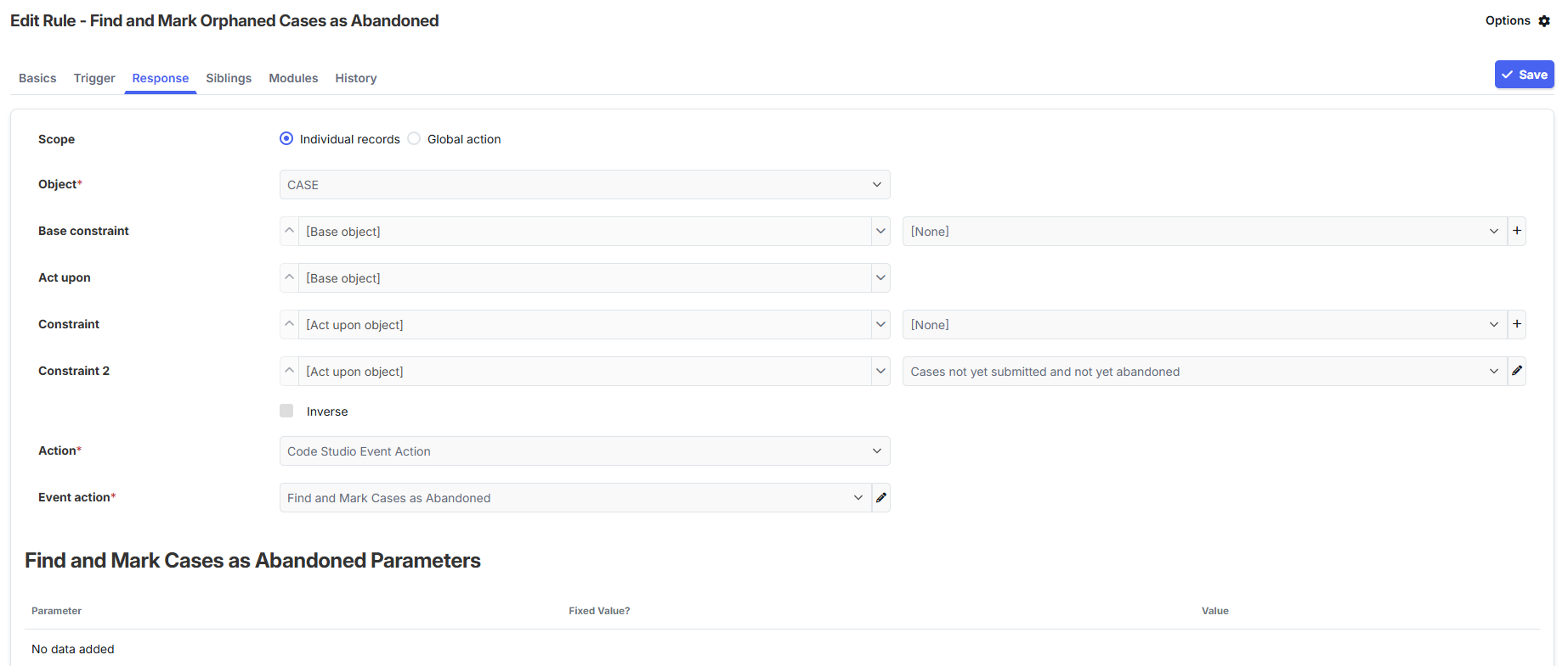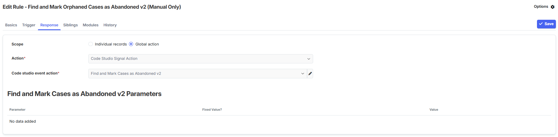 I tested the setup for Rule Response using a global action, as shown below, it fires the code studio event once - which means it will iterate through any cases that need to be abandoned and do so once.