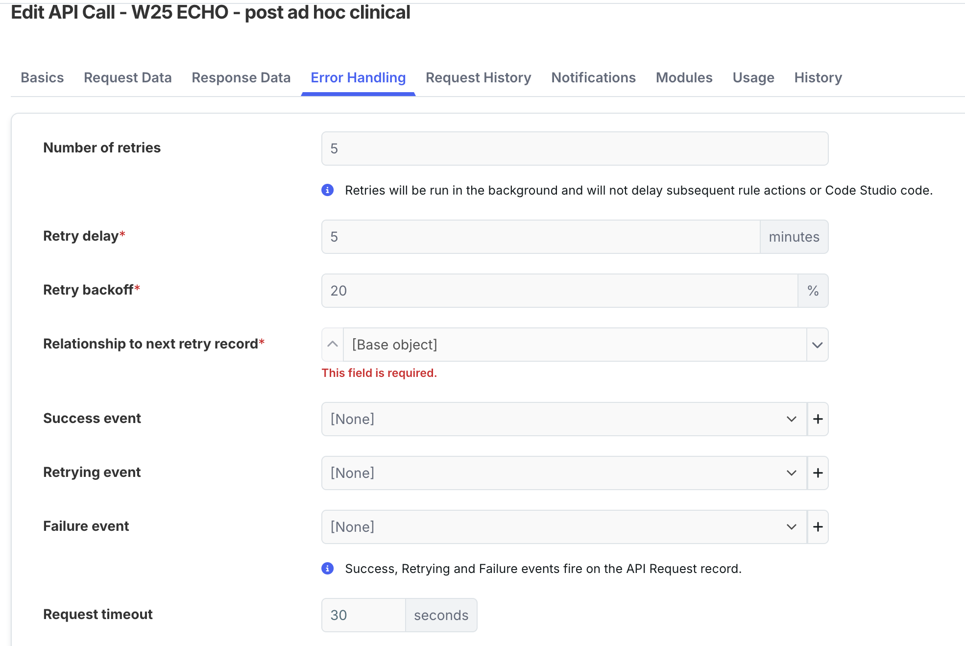I’m not sure how i’ve missed this feature all these years, however i’ve just stumbled across the error handling section of the API calls (i’ve been creating bespoke solutions for retrying failed API calls until today). Can anyone tell me what I put in the relationship field. Do I need to create a 1-many with the API object so it can list the retries against the original API call which failed?
